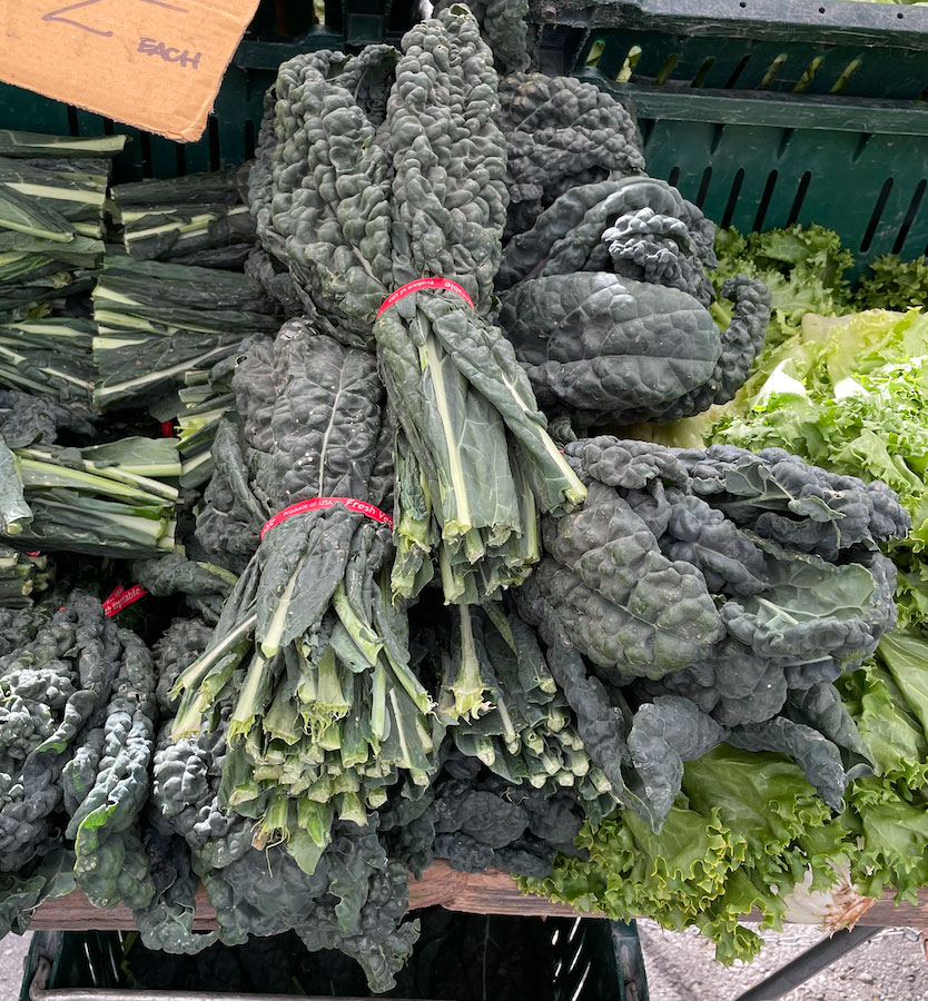 Black kale (aka dino kale) has hearty dark blue-green tall and narrow leaves with a slightly wrinkled and firm texture. Has a bit more of a delicate taste than the curly kind.