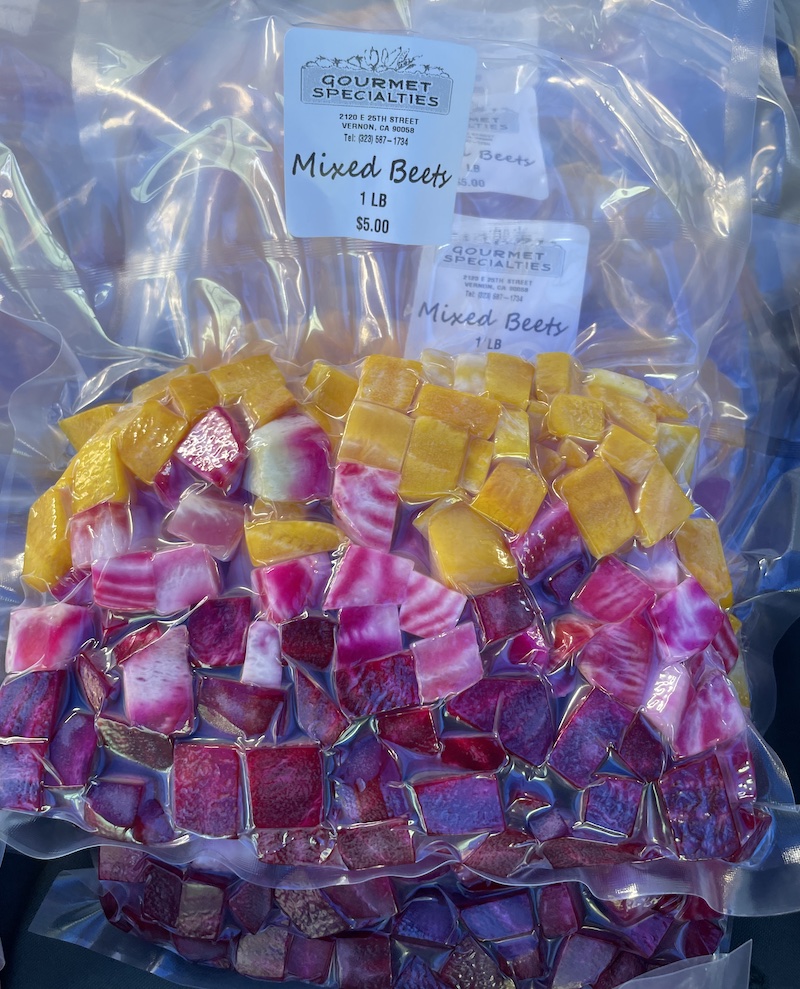 Pre chopped golden, red, and candy beets from our farm in southern California