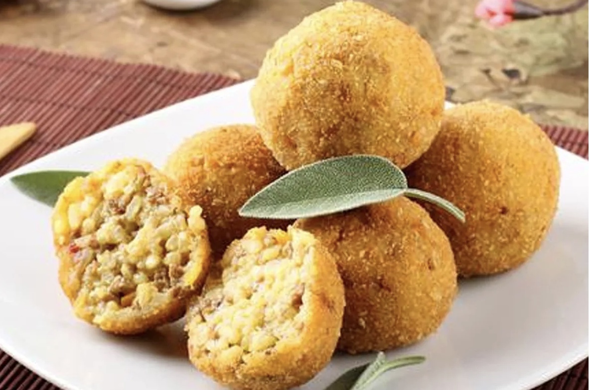 Arancino classico: Arborio rice, beef ragú (ground beef, tomatoes, celery, carrots, onions), peas, mozzarella cheese.