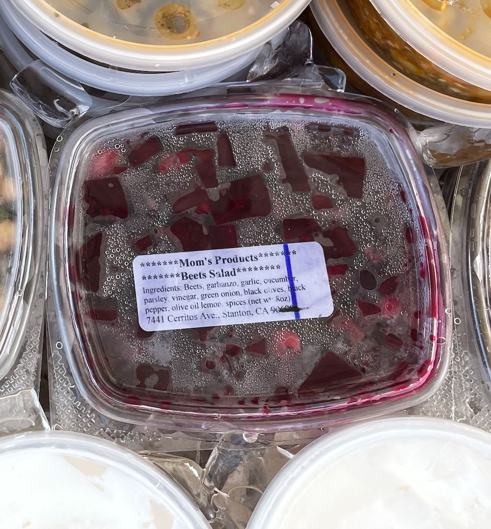 Ingredients: beets, garbonzo beans, garlic cucumber, parsley, vinegar, green onion, black olives, black pepper, olive oil, spices