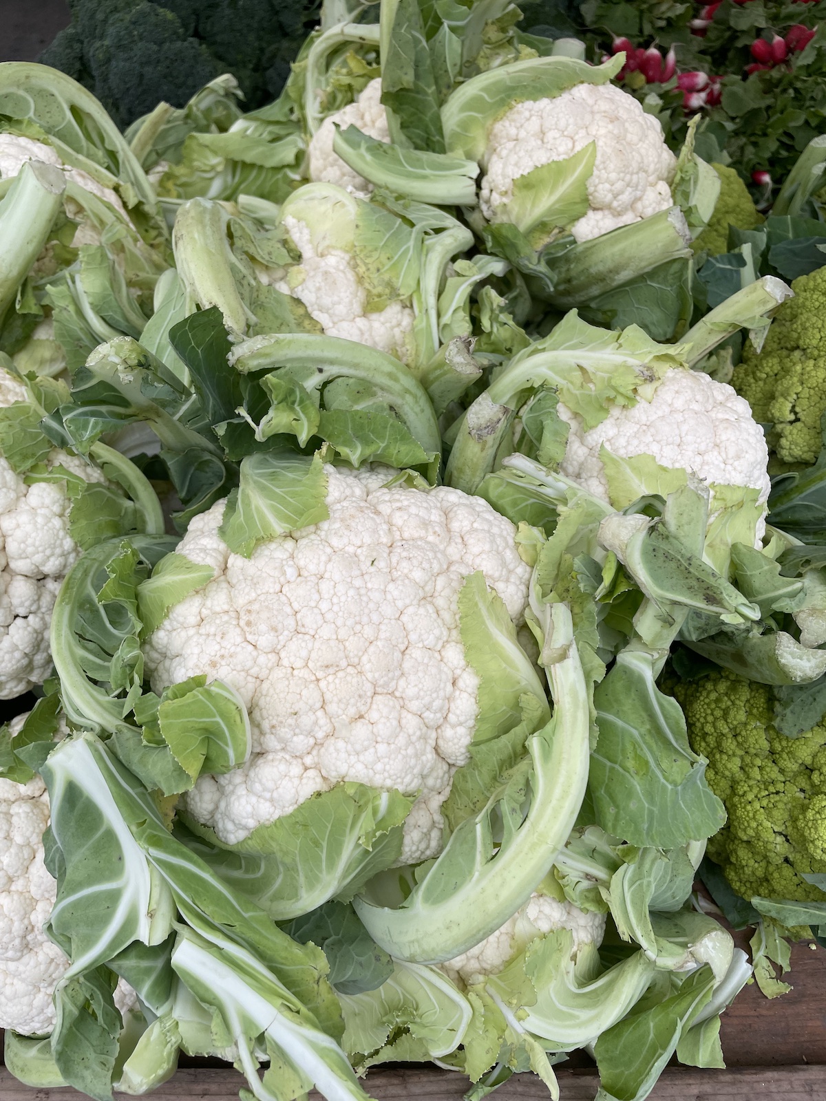 Cauliflower is a member of the cruciferous family. It has wonderful phytochemicals which fight off diseases. Remove the jacket leaves, core out the stem, and cut into florets, much like broccoli. If boiling cauliflower, add a teaspoon of fresh lemon juice to the water to maintain white color.