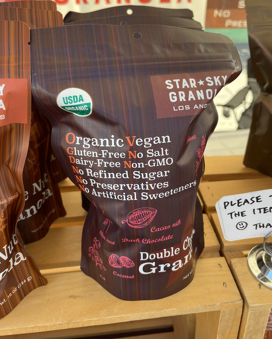 - Grain-Free Granola – Ingredients: Organic coconut chips, Organic pumpkin seeds, Organic almonds, Organic pecans, Organic coconut sugar, Organic chia seeds, Organic cinnamon