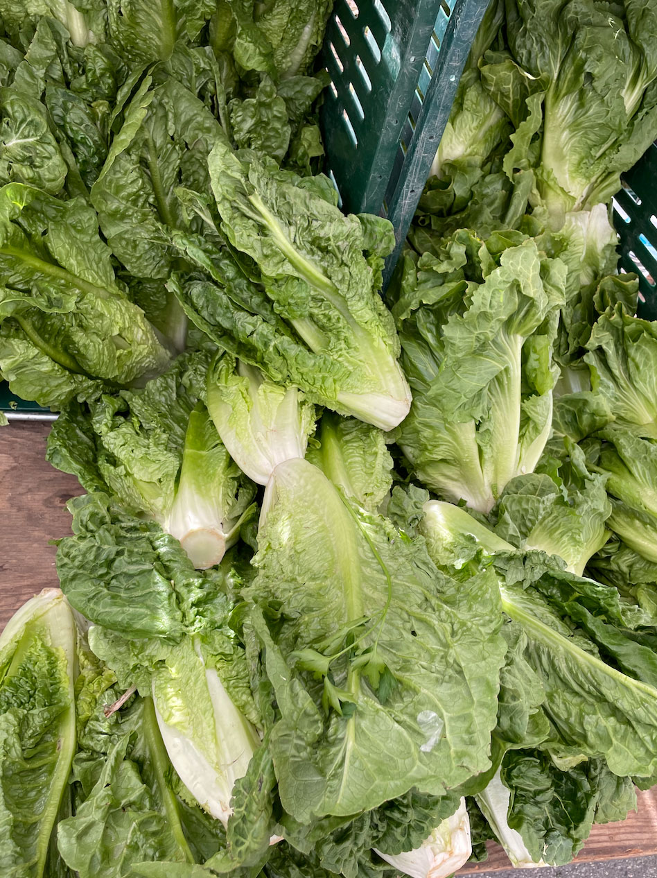 Romaine or Cos lettuce has a loaf-shaped appearance with long, dark green, upright outer leaves that often feature a white central spine. The outer leaves can be quite sturdy, while the inner leaves are often used in Caesar salads and are on the tender side.
