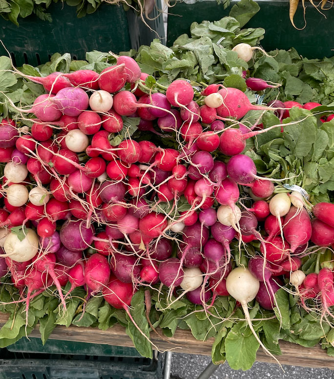 Easter radishes are related to the turnip and horseradish family, with a crisp texture and a peppery -hot flavor. This radish gets its name from the size and colors of the radishes. Store without the leafy tops and place in the refrigerator, wrapped in plastic to keep fresh for several days.