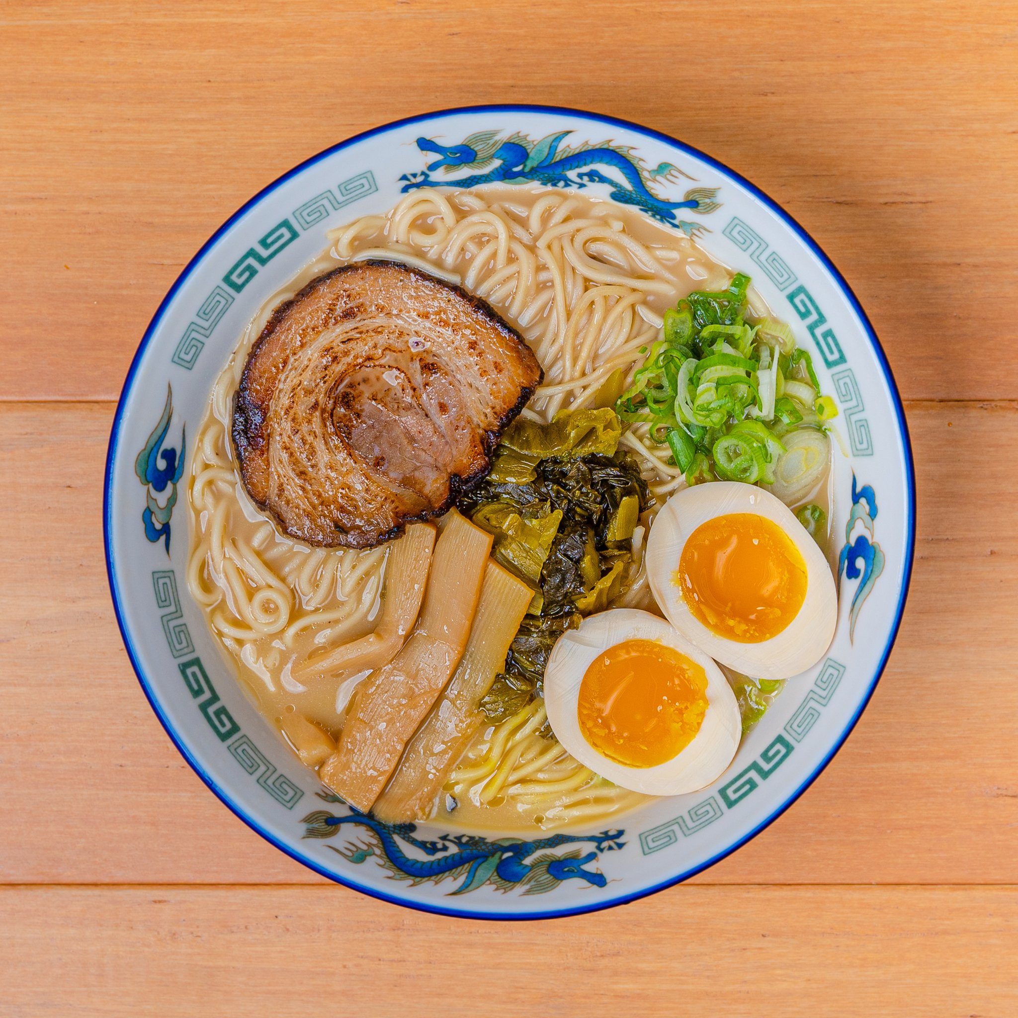 Two servings of 16-hr slow-simmered pork bone soup packet, fresh thin noodles, tender pork chashu, 24-hr marinated yolky eggs, pickled mustard greens, fish oil, bamboo shoots, and green onions.