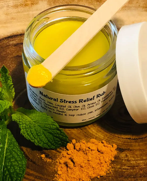 Natural Stress Relief Rub is made with all natural ingredients and the benefits of beeswax, beeswax is known for relieving pain and inflammation. Also, the benefits of essential oils can help with pain, stress, inflammation and bruises. Feel Relax, feel good.