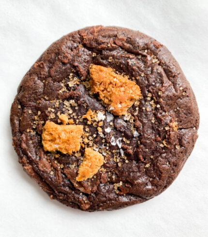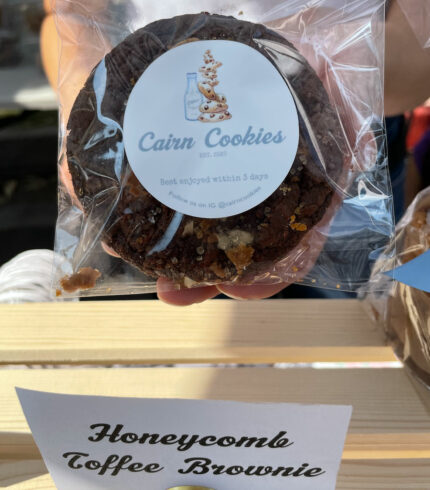 $3.00 – $17.00From: Cairn Cookies Deeply decadent chocolate brownie cookie with hand crafted caramelized honeycomb toffee chunks. Pricing: $3 for 1 | $17 for 6