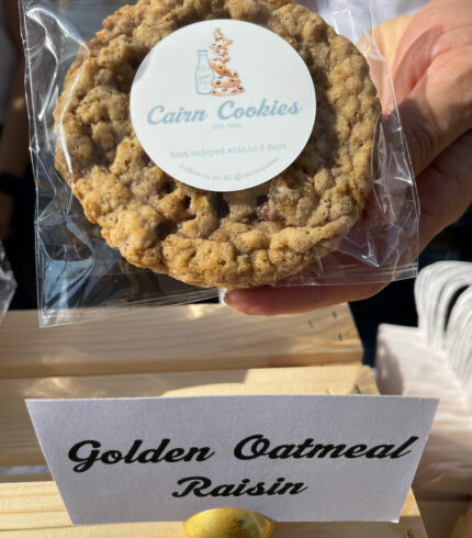$2.50 – $14.00From: Cairn Cookies Irish and old fashioned oats paired with golden raisins and chai latte spices. Pricing: $2.50 for 1 cookie | $14 for a cairn (6 cookies)