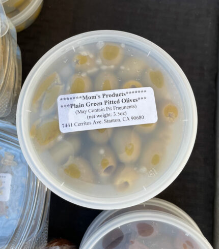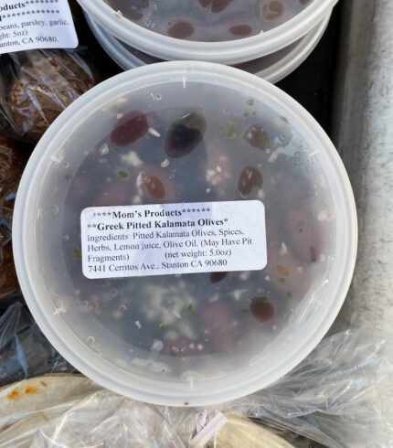 $6.00From: Mom’s Products Size: 5 oz Fresh made Greek pitted Kalamata olives Ingredients: pitted Kalamata olives, spices, herbs, lemon juice, olive oil