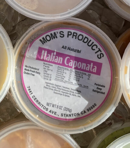 $6.00From: Mom’s Products Size: 8 oz Fresh made Italian caponata Ingredients: eggplant, tomato, tomato paste, water, celery, pitted kalamata olives, green pitted olives, olive oil, vegetable oil, garlic, salt, seasonings, spices