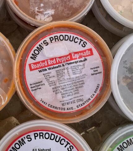 $6.00From: Mom’s Products Size: 8 oz Fresh made roasted red pepper tapenade with walnuts and pomegranate Ingredients: fire roasted red peppers, walnuts, tomato puree, bread crumbs, olive oil, pomegranate, molasses, ground chili pepper, salt, parsley, spices