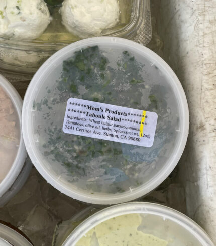 $6.00From: Mom’s Products Size: 12 oz Fresh made tabouleh salad Ingredients: wheat bulgar, parsley, onions, tomatoes, olive oil, herbs, spices