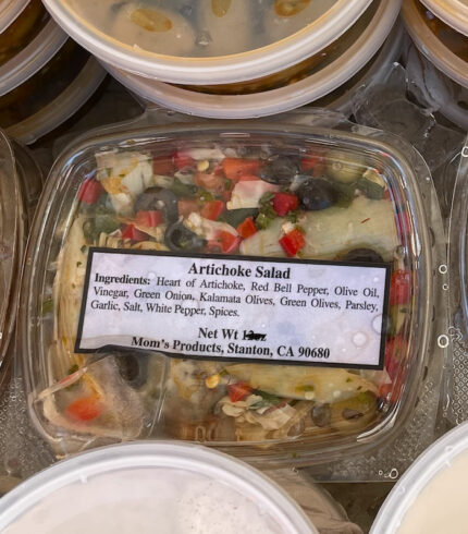 $6.00From: Mom’s Products Size: 12 oz Fresh made artichoke salad with red bell peppers and olives. Ingredients: Heart of Artichoke, Red Bell Pepper, Olive Oil, Vinegar, Green Onion, Kalamata Olives, Green Olives, Parsley, Salt, White Pepper, Spices