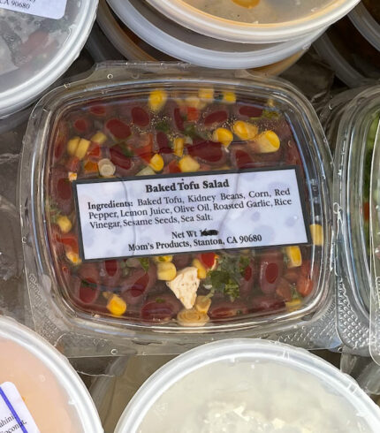 $6.00From: Mom’s Products Size: 12 oz Fresh made baked tofu salad with beans, corn, and pepper Ingredients: baked tofu, kidney beans, corn, red pepper, lemon juice, olive oil, roasted garlic, rice, vinegar, sesame seeds, sea salt