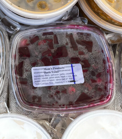 $6.00From: Mom’s Products Size: 8 oz Fresh made beets salad with garbanzo beans. Ingredients: beets, garbonzo beans, garlic cucumber, parsley, vinegar, green onion, black olives, black pepper, olive oil, spices