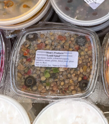 $6.00From: Mom’s Products Size: 8 oz Fresh made lentil salad with peppers and tomatoes. Ingredients: Lentils, yellow/red peppers, tomatoes, onions, pickles, lemon juices, spices