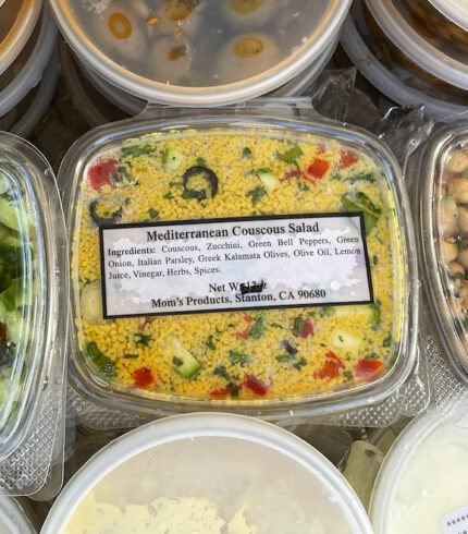 $6.00From: Mom’s Products Size: 12 oz Fresh made couscous salad Ingredients: couscous, zucchini, green bell peppers, green onion, Italian parsley, Greek kalamata olives, olive oil, lemon juice, vinegar, herbs, spices