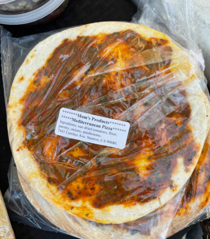$6.00From: Mom’s Products Fresh made Mediterranean pizza Ingredients: sun dried tomatoes, flour, parsley, onion, mushroom