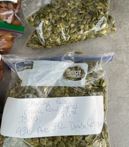 $16.00From: Etheridge Farms Amt: 1 bag (0.73 lb) Organic raw pepitas from our farm in southern California