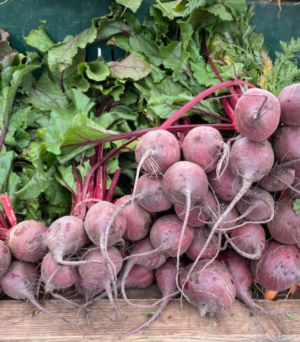 $3.00From: Underwood Family Farms Qty: 1 bunch Red beets have dark green tops. The inside of the beet is a dark red or burgundy. You can eat the greens as well, they taste like spinach. Greens will keep a few days in a plastic bag stored in the crisper.