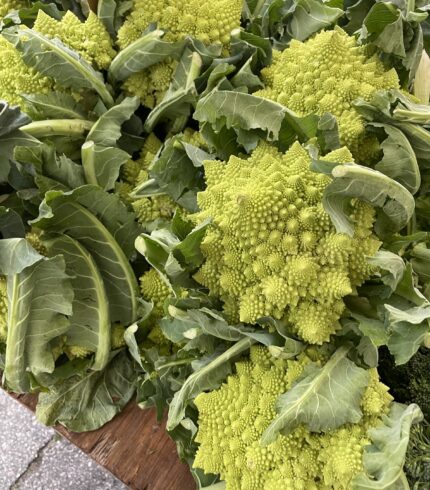 $5.50From: Underwood Family Farms Qty: 1 head Romanesco cauliflower is a type of cauliflower that is characterized by its unique, spiral-patterned head and its delicate, nutty flavor. It is a popular ingredient in Italian cuisine, where it is often roasted or steamed and served as a side dish. Romanesco cauliflower has