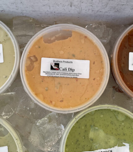 $6.00From: Brothers Products Size: 8 oz Our Cali Dip is made fresh in southern California and captures the essence of California in to a great tasting dip. Ingredients: garlic, chickpeas, basil, sun dried tomato, tahini sauce, lemon juice, olive oil, canola oil, salt
