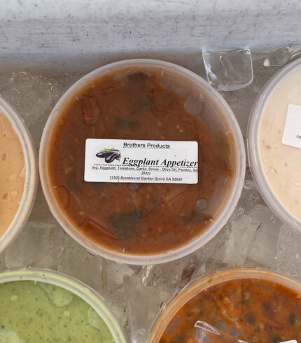 $6.00From: Brothers Products Size: 8 oz Fresh eggplant appetizer made from our family’s great recipe in southern California. Ingredients: eggplant, tomatoes, garlic, onion, olive oil, parsley, salt
